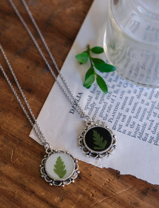 Ornate Scalloped Edge Pressed Flower Necklace with White Background